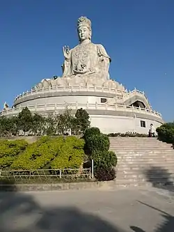 In June 2001, a statue of Saint Guanyin was completed. It is 33-metre (108 ft) high and weighs 3,300,000-kilogram (7,300,000 lb). Statue of Saint Guanyin sits in the lotus posture with a vase of clean water in hand, wearing Keyuru, necklaces and decoration and a precious crown on the head. There is a sitting statue of Amitābha on the crown, which is the main symbol of Saint Guanyin.[2][3]