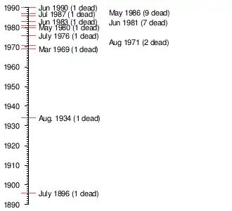 May 1986: Patricia Haythorn, 35, and David W. Schermer, 36, slipped off the edge of the mountain near Eliot Glacier. Haythorn did not survive the fall.[27]