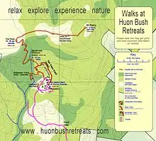 The car park and track head are at Huon Bush Retreats, Browns Road, Ranelagh.