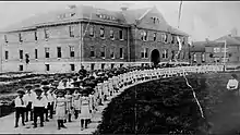 The Native American children at the boarding school received basic academic instruction in grades kindergarten through eighth (K-8) at the Mount Pleasant School. The strict and structured schedule was focused on vocational training and religious education. Classes were offered in English language, woodworking, farming, sewing/tailoring, laundry, housekeeping and basic first aid. The coursework included teaching students how to adapt and fit into "white culture".[2] Rumors of extreme abuse suffered by students as told by locals permeate the locale. The documentary film Indian School: Stories of Survival includes interviews with attendees of the Mount Pleasant Indian Industrial Boarding School and some of their descendants.[3][2] The Saginaw Chippewa Tribe maintains a YouTube channel documenting remembrance ceremonies for the students who attended and died there.[4]