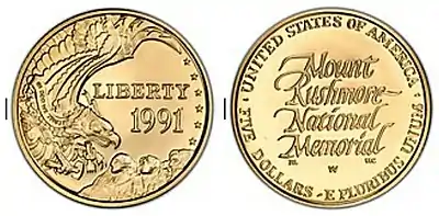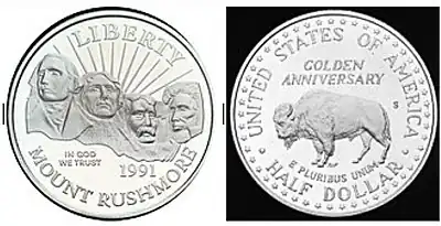 The Mount Rushmore Commemorative Coin Act (Pub. L. 101–332) authorized the production of three coins, a clad half dollar, a silver dollar, and a gold half eagle, to commemorate the 50th anniversary of the dedication of Mount Rushmore. The act allowed the coins to be struck in both proof and uncirculated finishes.[1] The coins were first released on February 15, 1991.