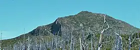 It lies in line behind Mount Lyell in views from high points in Queenstown and from the roads leading out to Strahan and Zeehan. Bands of the pink and grey coloured conglomerate show strikingly on its south west slopes. Its western and south western slopes are significantly more precipitous and rocky, compared to the once heavily forested southern and south eastern slopes.[2]