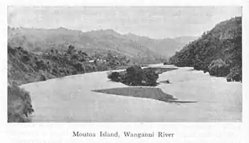 Surrounded by rapids, it has been the site of many battles, the most famous being on 14 May 1864, between a force of Pai Mārire followers from the upper Whanganui and Ngāti Hau from the lower Whanganui, during the Second Taranaki War. A statue unveiled in 1865 in Moutoa Gardens in Whanganui commemorates the battle.[1]