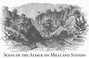 Writer and explorer John Ross Browne visited the area in early 1864, and he described the situation in his book "Adventures in the Apache Country." According to Browne, early in the morning on December 29, 1863, two young men named J.B. Mills and Edwin Stevens were traveling on the trail to the Mowry Mine, both were employees of Mowry. Two young Mexican boys were traveling nearby and discovered Apache tracks, after which they saw Mills and Stevens riding to the entrance of the canyon.[1] The boys suspected an attack so they shouted "Los Apaches" at the riders but they did not hear. The Mills and Stevens were about four miles away from the settlement when they were attacked by the Apaches hiding in the bushes at the entrance of a canyon. Several shots were fired in rapid succession, and Stevens was killed and fell off his horse. Mills was armed so he fought the Apache until bleeding to death from his wounds. After hearing the massacre, the boys turned around and rushed back to Mowry where a four-man posse was formed and sent to the canyon within minutes but by that time it was already to late and the Apaches had escaped.[1]