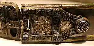 The Moylough Belt-Shrine is a highly decorated 8th-century Irish reliquary shaped in the form of a belt. It consists of four hinged bronze segments, each forming cavities that hold strips of plain leather assumed to have once been a girdle belonging to a saint and thus the intended relic.[2] It remains the only known relic container created as a belt-shrine,[3] although such objects are mentioned in some lives of Irish saints, where they are attributed with "remarkable cures", and there are surviving reliquary buckles in continental Europe. The belt may have been influenced by 7th-century Frankish and Burgundian types.