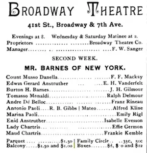 - ↑ (1 December 1888). Broadway Theatre ad, The Sun (New York) (advertisement shows Mr. Barnes playing on Saturday December 1, with a new show, Little Lord Fauntleroy, starting on Monday December 3, 1888)