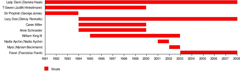 | Past members | Delroy Rennalls (LayZee) Judith Hinkelmann (T-Seven) Daniela Haak (Lady Danii) George Jones (Sir Prophet) Myriam Beckmann (Myra) Franziska Frank (Franzi) Nadia Ayche Caren Miller Anne Schroeder William King III |