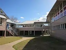 Prior to the removal of the original teaching building,[33] a new State School building of a standard government design was constructed in 1917 within the new school reserve. To help ensure consistency and economy, the Queensland Government developed standard plans for its school buildings. From the 1860s until the 1960s, Queensland school buildings were predominantly timber-framed, an easy and cost-effective approach that also enabled the government to provide facilities in remote areas. Standard designs were continually refined in response to changing needs and educational philosophy and Queensland school buildings were particularly innovative in their response to climate control, lighting, and ventilation. Standardisation produced distinctly similar schools across Queensland with complexes of typical components.[34][1]