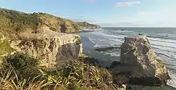 Maukatia (Maori Bay) to the south is separated from Muriwai Beach by Otakamiro Point, with its steep cliffs and rocky nesting areas that are home to the region's only colony of Australasian gannets. The site of the gannetry has been identified as an Important Bird Area by BirdLife International.[2]
