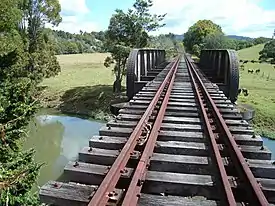 The Murwillumbah railway line is a mostly disused railway line in far north-eastern Northern Rivers New South Wales, Australia. The line ran from Casino to Lismore, Byron Bay, Mullumbimby and Murwillumbah, opening in 1894.[1] It is one of only two branches off the North Coast line, (the other being the Dorrigo line). Train services to the region ceased in May 2004. The line from Casino to Bentley and Murwillumbah to Crabbes Creek was formally closed on 23 September 2020 to facilitate the construction of a rail trail.[2]