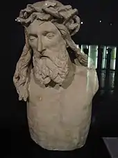 The monks' dormitory exhibits Romanesque sculptures, including a bust of Jesus Christ wearing a crown of thorns sculpted by Claus Sluter. The bust is a fragment of a larger limestone crucifix that was erected in the courtyard of the Carthusian monastery of Champmol in Dijon as part of Sluter's Well of Moses. It was removed from the monument at an unknown time in the 18th century and later transported to the museum after being located in a wall in Dijon in the 19th century.[3] The accompanying sculpture of Mary Magdalene has been lost.[4]
