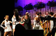 The show takes its name from "Musikanten" meaning musicians and "Stadl" which is the Austrian-Bavarian word for barn. The first Musikantenstadl was broadcast in Enns Austria and mainly consists of easy listening, catchy music (Schlager and Volkstümliche Musik) and conversations between the presenter, musicians and members of the audience. Each episode which is referred to as a Stadl is broadcast from different locations in either Austria, Switzerland, Germany and sometimes South Tyrol in front of a live audience at a large city or small town arena. The audience members sit at long tables in a German beer house style and are served drinks from a bar. Most also arrive to the show wearing Tracht including Lederhosen and Dirndl's. There have been two set backdrops since 1981; in 2005 a new set was introduced along with the new presenter Andy Borg which included a staircase. Since the start, the Wolfgang-Lindner Band from Austria has provided the music which the artists sing and audience members dance to. When the original band leader, Wolfgang Lindner Sr., died, his son, Wolfgang Lindner Jr., took his place and now plays drums in the band. In 2005 the original theme music Trumpet Echo was replaced with the new Stadlzeit which also includes words which are sung by Andy Borg at the opening and closing of each show.
