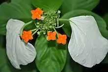 Mussaenda villosa is a species of flowering shrub in the family Rubiaceae. It has orange petals and white bracts.