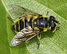 The species has a wing length of 7–12 mm (0.3–0.5 in). Thorax dorsum with a characteristic "skull" black pattern. Abdomen black with yellow patterning. Legs pale and black. The larvae of the species were described and figured by Graham E. Rotheray in 1993.[5] See references for determination.[6][7][8][9]