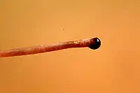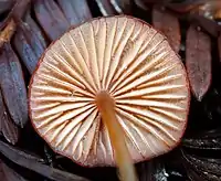 The gills are adnate or slightly toothed, and well-spaced. They are narrow to moderately broad, sordid reddish to grayish, with even edges that are dark reddish brown. The stipe is 2–6 cm (0.8–2.4 in) long, 1–1.5 mm thick, equal in width throughout, and fragile. The base of the stipe is covered with coarse, stiff white hairs, while the remainder is covered with a drab powder that soon sloughs off to leave the stipe polished, and more or less the same color as the cap. It also exudes a bright or dull-red juice when cut or broken.[9] The edibility of the mushroom is unknown—but it is considered too insubstantial to be of culinary interest.[5][6]