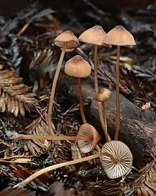 Mycena sanguinolenta, commonly known as the bleeding bonnet, the smaller bleeding Mycena, or the terrestrial bleeding Mycena, is a species of mushroom in the family Mycenaceae. It is a common and widely distributed species, and has been found in North America, Europe, Australia, and Asia. The fungus produces reddish-brown to reddish-purple fruit bodies with conic to bell-shaped caps up to 1.5 cm (0.6 in) wide held by slender stipes up to 6 cm (2.4 in) high. When fresh, the fruit bodies will "bleed" a dark reddish-purple sap. The similar Mycena haematopus is larger, and grows on decaying wood, usually in clumps. M. sanguinolenta contains alkaloid pigments that are unique to the species, may produce an antifungal compound, and is bioluminescent. The edibility of the mushroom has not been determined.