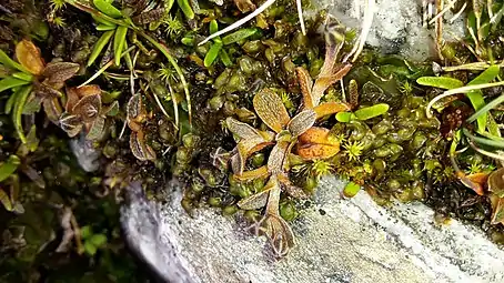 Myosotis bryonoma Meudt et al. is in the plant family Boraginaceae and was originally described in 2018 by Heidi Meudt, Jessica Prebble and Michael Thorsen.[3][2] It is morphologically most similar to M. tenericaulis, another creeping, bracteate-prostrate species of Myosotis, and also shares some morphological characters with other bracteate-prostrate species, M. colensoi and M. cheesemanii.[2] It can be distinguished from M. tenericaulis by its shorter (<5 mm long) and wider (>0.7 mm) petioles, smaller leaves (generally <6 mm long), appressed trichomes that are parallel to the mid vein, rosette leaves that are glabrous on the underside, shorter inflorescences (10–45 mm long) and internodes (<5 mm), and fewer flowers per inflorescence (1–3).[2] M. bryonoma can be distinguished from M. colensoi and M. cheesemanii by its shorter rosette leaf petioles (< 4 mm long), shorter calyces (< 3.5 mm long at flowering), calyx lobes which are longer than half the length of the calyx, rosette leaves usually glabrous abaxially, and shorter corolla tube (< 4.3 mm long).[2]