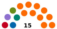The Assembly elected at the 2019 local government elections, is made up of 15 counselors, with the following party composition:[1]
