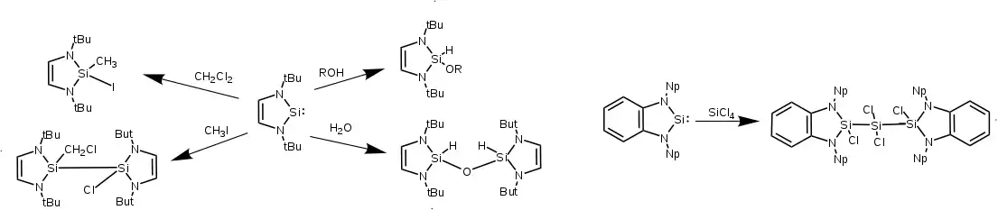 NHSis insert into σ bonds to form terminal silane-like products, NHSi-NHSi disilane bridges, or oxo-bridged NHSi siloxanes. Alcohols react with Si(II) to form exclusively the silyl ether. With water, two NHSis will insert to each of the O-H bonds to form a siloxane. A more varied reactivity is seen with haloalkanes. NHSis insert directly into the C-I bond of iodomethane. Alternatively, when saturated or unsaturated NHSis are reacted with dichloromethane, chloroform, or carbon tetrachloride, the silicon centers of two NHSis form a bond, with one halide adding to one silicon and the remaining organic fragment adding to the other. Other halocarbons will yield a mixture of mono and disilane products. The resulting mixture of products as well as computational studies indicate that a free radical mechanism brings about these products, with the radical pathway being 16 to 23 kcal/mol lower in energy than concerted mechanisms. Upon heating, the disilanes either disproportionate to an NHSilane and NHSilylene, or form a one-carbon bridge between two NHSi-X fragments in a vein similar to water's reactivity. In the presence of silicon tetrachloride, benzo-fused NHSis will insert between two Si-Cl bonds to form a trisilane.[14][4]