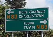 The N83 road is a national secondary road in Ireland that runs (north to south) from its junction with the N17 just south of Ireland West Airport Knock in County Mayo to a point just north of Tuam, County Galway where it rejoins the N17. On 27 September 2017, the old N17 from the Kilmore Roundabout in Tuam to the junction with the N6 in Galway city was redesignated as the N83.