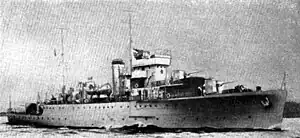 Armament consisted of three 120-millimetre (4.7 in) guns in single mounts on the ship's centreline, with two forward and one aft. Four 2-pounder (40 mm) pom-pom anti-aircraft (AA) guns were fitted, while four depth charge throwers provided an anti-submarine armament.[2] In 1943, the 40 mm guns were removed and replaced by five single-mounted 20 mm (0.79 in) AA cannon.[3]