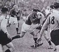 Tom Bourke of Balmain, with the ball, is about to be tackled by the Newtown defence. In the foreground Balmain pair Stan Ponchard (No.7) and Keith Parkinson (No.18) watch on.