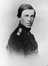 She met Rimsky-Korsakov at Dargomyzhsky's home in the spring of 1868. Not long after their first meeting he wrote a song which he dedicated to her. He also started visiting her frequently, both at the Purgold home in St. Petersburg and at the family's summer residence in Lyesnov.[6] She found in him an abundance of warmth and gentleness.[7] He proposed to her in December 1871,[8] and they married in July 1872.[9] Mussorgsky was Rimsky-Korsakov's best man.[10] The Rimsky-Korsakovs would eventually have seven children. Nadezhda was to become a musical as well as domestic partner with her husband, much as Clara Schumann had been with her own husband Robert.[9] Beautiful, capable, strong-willed and far better trained musically than her husband at the time they married,[9] she proved a good and most demanding critic of his work; her influence over him in musical matters was strong enough for Balakirev and Stasov to wonder sometimes whether she was leading him astray from their musical preferences.[11] Although she gradually gave up composition after her marriage, she had a considerable influence on the creation of his first three operas.[12] She travelled with her husband, attended rehearsals and proofread and arranged compositions by him and others.[12] Years later, Nikolai Rimsky-Korsakov wrote: "The overture [from The Maid of Pskov], from the first note to the last one, belongs to a no-good girl whom I love very, very much."[13]