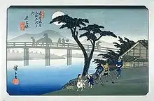 Hiroshige's print of Nagakubo-shuku, part of The Sixty-nine Stations of the Kiso Kaidō series. The title of this print is "Man on Horseback Crossing a Bridge." It is the Wada Bridge across the Yoda River.