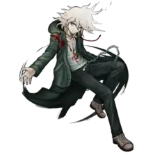 In Danganronpa 2: Goodbye Despair, Nagito is an apparently optimistic, subservient student accepted into Hope's Peak Academy by a raffle, who then received the title of Ultimate Lucky Student (超高校級の「幸運」, Chō-kōkō-kyū no "Kōun", lit. Super High School Level Good Luck). Outwardly presenting as a friendly, upbeat, somewhat meek young man, his true demeanor, revealed following the beginning of Monokuma's killing game, is shown to be quite deranged in his pursuit of hope, believing it to be an absolute good that only his talented classmates can achieve, willing to bring about great despair to create the greatest of hopes. Because of his beliefs, he is completely willing to let his talented classmates walk over him, seeing himself as inferior to them, all while keeping his cheerful, optimistic attitude and frequently referring to himself as a "stepping stone for [their] hope."[13] He manipulates Teruteru Hanamura into killing Byakuya Togami to start the killing game. He remains cheerful and enthusiastic even in horrifying situations when someone has died, which results in his classmates fearing him and finding him creepy.[14] This is compounded by the fact that he is revealed in his Free Time Events to have a degenerative brain disease slowly eating away at his ability to think rationally, which could kill him at any moment. He also feels deep self-loathing over the nature of his talent being, in his mind, lackluster compared to his classmates' talents, seeing himself as not a true "Ultimate" compared to those around him while at the same time expressing disdain for "normal" people like himself.