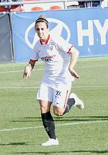 In October 2012 she made her debut for the Spain women's national football team in the second leg of the 2013 European Championship's repêchage, which marked Spain's second qualification for the championship, sixteen years after their first.[1] As a junior international she won the 2010 U-17 European Championship[2] and a bronze in the 2010 U-17 World Cup.[3]