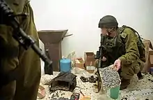 Israel Defense Forces soldiers examining an explosives factory in Nablus containing various types of improvised shrapnel, 2002.
