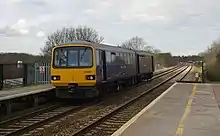 The station has two platforms, separated by two running lines. The line runs on a slight curve through the station, at an angle of roughly 067 degrees,[5] and has a linespeed of 100 miles per hour (160 km/h). The northern platform, platform 2, is 121 metres (132 yd) long and serves eastbound trains; the southern platform, platform 1, is 122 metres (133 yd) and serves westbound trains.[6] Access to the two platforms is by steps from the road on either side. There is a ramp to the eastbound platform, but it has a gradient greater than 1 in 12, and there is no ramp access to trains. There is no ramp access to the westbound platform. Access between the platforms is either by a footbridge, or by walking along the main road under the line.[7] There are metal and glass waiting shelters on both platforms – three on the eastbound platform, one on the westbound.[1] Two ticket machines are situated on the north side of the station, which can also be used to collect pre-bought tickets. These machines are supplemented by a small ticket kiosk on the eastbound platform which is open during the morning peak.[7] "Next train" dot-matrix displays and an automated public-address system announce approaching services.