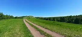 The Nakas rises in northern Tyulgansky District, near the border with Bashkortostan. Rather than a mountain or ridge the Nakas is an elevated area, where its 667.6 m (2,190 ft) high summit —the highest point of Orenburg Oblast— is only a slightly bulging plateau.[5] Despite the lack of pronounced relief the Nakas forms an important drainage divide, separating the basins of the Belaya, Salmysh and Bolshoy Ik rivers.[3][6]
