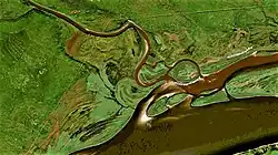 The Namanа is a left tributary of the Lena flowing through uninhabited territory. It is formed at the confluence of the Usttaakh and Orguy rivers in the Lena Plateau. It heads across the plateau through a narrow valley, meandering increasingly. After descending into the floodplain it flows in a roughly southern direction within a wide basin dotted with lakes. Finally it meets the left bank of the Lena 2,044 kilometres (1,270 mi) from its mouth, 50 kilometres (31 mi) northeast of the city of Olyokminsk. The river basin is fed by rain and snow. Floods are common in the summer period.[1][4][5]