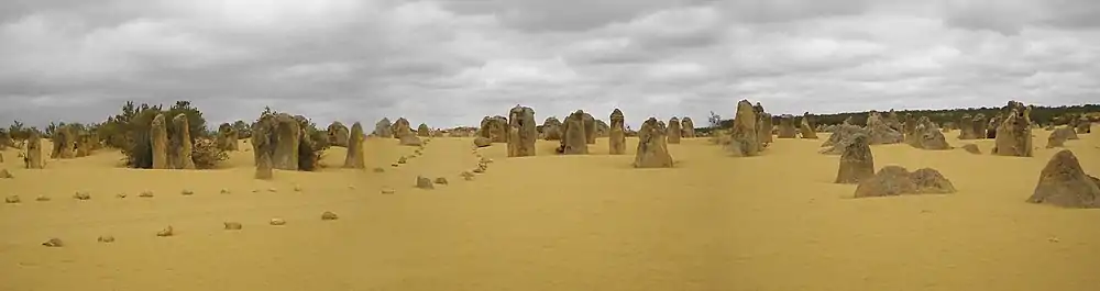 Nambung National Park is a national park in the Wheatbelt region of Western Australia, 200 km northwest of Perth, Australia and 17 km south of the small coastal town of Cervantes.[3] The park contains the Pinnacles Desert which is an area with thousands of limestone formations called pinnacles.[4]