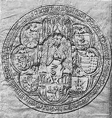 From Algirdas, Jogaila inherited a mixed array of styles, as recorded in different Catholic documents, to indicate his status as supreme ruler: the titles furst, herczog, rex, and dux are preceded by the adjectives gross, obirster, supremus, and magnus.[5] The Lithuanian rulers' various titles are all attempts to convey both supremacy over lower rulers, and independence of any higher ruler. The term kunigas is cognate with German König.[4] Algirdas, who had married Uliana, daughter of Alexander I, grand prince of Tver, had been the first Lithuanian ruler to style himself velikii kniaz, a Rus'ian equivalent of his Lithuanian title, perhaps also signifying his rule in the Rus' lands under his control. He also called himself magnus rex and supremus princeps.[4] Rather than didysis kunigaikštis, many of Jogaila's subjects would have called him hospodar, the title used, for example, by the rulers of Moldavia.[6]