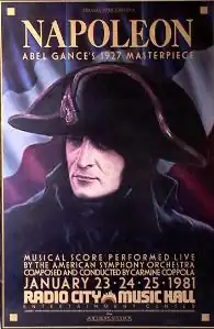 Brownlow's 1980 reconstruction was re-edited and released in the United States by American Zoetrope (through Universal Pictures) with a score by Carmine Coppola performed live at the screenings. The restoration premiered in the United States at Radio City Music Hall in New York City on 23–25 January 1981; each performance showed to a standing room only house.[15] Gance could not attend because of poor health. At the end of 24 January screening, a telephone was brought onstage and the audience was told that Gance was listening on the other end and wished to know what they had thought of his film. The audience erupted in an ovation of applause and cheers that lasted several minutes. The acclaim surrounding the film's revival brought Gance much-belated recognition as a master director before his death eleven months later, in November 1981.[27]