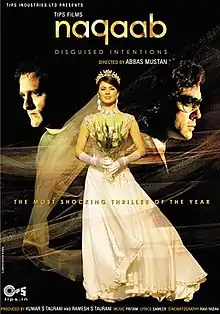 Naqaab (transl. Mask) is a 2007 Indian Hindi-language suspense thriller film directed by the famous duo Abbas–Mustan. The film reunites Akshaye Khanna and Bobby Deol after Humraaz in 2002, which was also directed by Abbas-Mustan. Additionally, Deol and Khanna played the antagonist and protagonist roles in this film, respectively, which were the opposite roles of what they played in Humraaz. This is also the fourth collaboration of Deol and Abbas-Mustan. Also, former model Urvashi Sharma makes her film debut as the leading actress of the film. The story of the film is inspired by the Hollywood movie Dot the I.