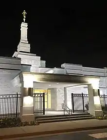 The intent to build the Nashville Tennessee Temple was announced in 1994.[2] The temple originally was to be built in the affluent suburb of Forest Hills, but the plan was turned down by city commissioners due to zoning rules.[3] It was eventually built next to an existing meetinghouse in Franklin using the church's small temple plan. The temple's exterior is constructed from Imperial Danby white marble and has a single spire topped with the familiar statue of the angel Moroni. The temple serves church members in central and eastern Tennessee and western Kentucky.