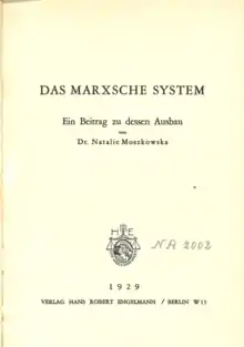 Moszkowska's first book after her thesis was The Marxist System (Das Marxsche System),[4] published in 1929 by the Berlin editor Robert Engelmann. The first part of the book defends the labour theory of value, similar to the point of view of Ladislaus von Bortkiewicz. Moszkowska used an unusually high number of digital examples of the transformation of value into the price of production.
