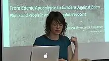 Natasha Myers is an associate professor of anthropology at York University.[1] In 2016 she coined the term "Planthroposcene".[2][3] Her first book, Rendering Life Molecular: Models, Modelers, and Excitable Matter is an ethnography of protein crystallographers and discusses how scientists teach one another how to sense the molecular realm.[4] This book won the 2016 Robert Merton Book Prize from the Science, Knowledge, and Technology Section of the American Sociological Association.[5] She received her BSc in biology from McGill University, a Masters in Environmental Studies from York University's Faculty of Environmental Studies and her PhD in the Program in History, Anthropology, and Science, Technology & Society (HASTS) at the Massachusetts Institute of Technology.[6]