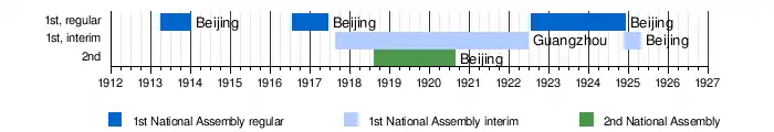 The National Assembly (Chinese: 國會) was the legislative branch of the Beiyang government during the Republican era of Chinese history.[1] The National Assembly was first founded in 1913, following the overthrow of the previous Qing dynasty, as the first free democratic legislature in Chinese history. It was disbanded less than a year later as President Yuan Shikai assumed dictatorial power and declared himself the Emperor of China. During the Warlord Era, the National Assembly was resurrected and disbanded more than once as different warlords vied for power and legitimacy.