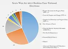 A pie chart showing how many seats won in the 2015 Burkina Faso National Assembly Elections. The "other" category includes 6 separate political parties.[12]