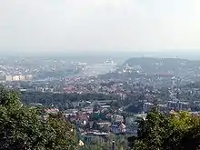 The Pilis Mountains lie in the big bend of the Danube, where it turns towards southern direction from the earlier western-eastern direction. The route of the Blue Trail is similar to a big, inverse "Ω" letter here; the Trail first goes in southern direction until the area of Budapest, only touching the forests of the capital (Mountains of Buda). Not much later the path returns to the Pilis Mountains and reaches the Danube at the Danube Bend at Visegrád, a popular tourist destination known for its castle atop the hill.