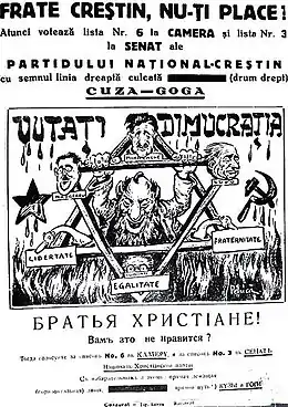 The National Christian Party (Romanian: Partidul Național Creștin) was a far-right[1] authoritarian and strongly antisemitic[2] political party in Romania active between 1935 and 1938. It was formed by a merger of Octavian Goga's National Agrarian Party and A. C. Cuza's National-Christian Defense League (LANC); a prominent member of the party was the philosopher Nichifor Crainic. Goga was chosen in December 1937 by King Carol II to form a government which included Cuza. The government lasted for only 44 days and was followed by a royal dictatorship by Carol.