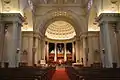 The large neoclassical church building was designed by John Russell Pope and completed in 1930.[12] The structure has a "monumental character" typical of Pope's style and seen in his other works, such as the Jefferson Memorial.[13] The church's design was partly influenced by James Gibbs' St Martin-in-the-Fields church, built at Trafalgar Square, London, in the early 18th century.[14] The building is built of Indiana limestone. Scholar Thomas A. Tweed writes that the building's facade, "high on a terrace overlooking Thomas Circle, a prominent location in the city ... demands the attention of motorists and pedestrians."[13]