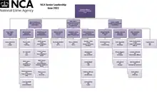 The NCA is organised into eight operational branches, overseen by seven directors, who are in turn overseen by a Director General, assisted by a Deputy Director General.[42] The commands are as follows: