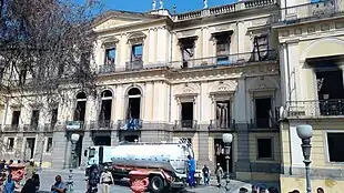 A large fire broke out shortly after the museum closed on 2 September 2018, reaching all three floors of the building.[20][21][22] Firefighters were called at 19:30 local time (22:30 UTC)[23] and arrived quickly at the scene.[19] However, the fire chief reported that the two fire hydrants closest to the museum had no water, and trucks had to be sent to a nearby lake.[24] According to the spokesman for the fire department, the fire crews went inside the burning building to rescue artifacts, despite there being no people inside, and they were able to remove items with the help of museum staff.[25][26]
