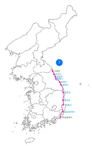 National Route 7 (Korean: 국도 제7호선; RR: Gukdo Je Chil(7) Hoseon) is a national highway in South Korea. It connects Busan with Goseong in Gangwon Province. Before the division of the Korean Peninsula, the highway ran until Onsong, North Hamgyong Province, in present-day North Korea.