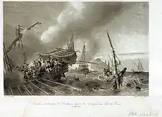 Vice Admiral de Montigny, Abraham Duquesne, and other commanders came close and attacked the Spanish galleys. The Spaniards panicked and began to evacuate the galleys which had taken refuge behind the mole, one of which was set on fire by a French fireship.[9] Firstly the Genoese and later the Spaniards, in all 4,500 men, tried to escape both by swimming or aboard the boats of the galleys. About 300 of them drowned.[9] The confusion amidst the town was considerable, with soldiers and civilians diving into the waves with carts to collect the supplies. Several Spanish galleys were lost: Duquesa of Genoa and Patrona of Sicily sank, the Spanish Santa Barbara of Antonio de Sobremonte was about to sink, as well as Patrona of Genoa and Quatralba of Sicily.[3] The Santa Olalla ran aground near Salou and was destroyed by a party of French cavalry. 450 prisoners and 3 Spanish flags were taken. One of the Spanish officers killed was Captain Leonardo de Moles, infamous all over Catalonia for his crimes against the populace of the country.[2]